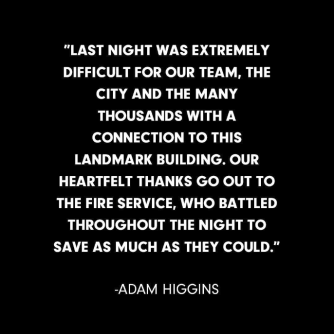 “Last night was extremely difficult for our team, the city and the many thousands with a connection to this landmark building. Our heartfelt thanks go out to the fire service, who battled throughout the night to save as much as they could.”